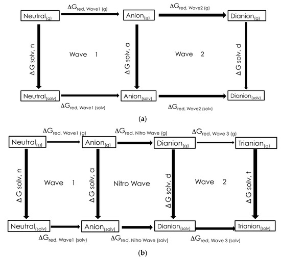Visual representation of the thermodynamic cycles used to calculate the change in free energy of reduction (∆Gred): (a) wave 1 (first reduction of the diazine ring) and wave 2 (second reduction of the diazine ring) for derivatives without a nitro group (A1-D4) and (b) wave 1 (first reduction of the diazine ring), nitro wave (nitro group reduction) and wave 2 (second reduction of the diazine ring) for derivatives containing a nitro group (E1-E4).