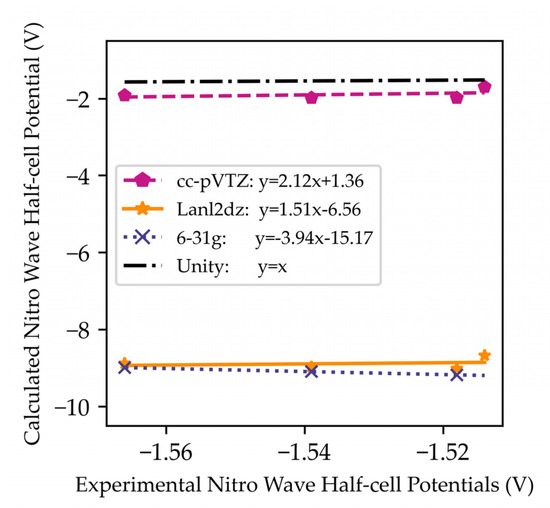 Figure 6b demonstrates that even with the nitro group containing compounds removed, there is a low correlation with the experimental data. The best fit for the B3LYP/cc-pVTZ, B3LYP/lanl2dz, and B3LYP/6-31G methods are y = 0.30x − 1.66 with R2 of 0.327 and standard error of 0.07 V, y = 0.40x − 1.68 with R2 of 0.313 and standard error of 0.097 V, and y = 0.36x − 1.83 with R2 of 0.307 and standard error of 0.088 V, respectively. Like the wave 1 results, once the nitro group containing derivatives are removed, all three methods improved their predictive ability and have a similar correlation with the experimental data with R2 ranging from 0.307 to 0.327. It is worth noting that the removal of derivatives B1 and D1, which were indicated in the experimental data set as having a shoulder, does improve the correlation to experiment for the non-nitro-group containing derivatives (Appendix A Figure A2b). The best fits for the B3LYP/cc-pVTZ, B3LYP/lanl2dz, and B3LYP/6-31G methods improve to y = 0.43x − 1.37 with R2 of 0.379 and standard error of 0.07 V, y = 0.64x − 1.17 with R2 of 0.430 and standard error of 0.094 V, and y = 0.52x − 1.47 with R2 of 0.360 and standard error of 0.089 V, respectively. The elimination of B1 and D1 from the comparison does increase the correlation of the data with R2 values now between 0.360 and 0.430; and, unexpectedly, the lanl2dz basis set has the best correlation when B1 and D1 are removed from analysis.