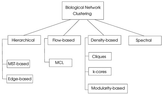 where are the percentages of the number of edges in , and is the percentage of edges with at least one edge in . This parameter shows the sum of the differences of probabilities of an edge being in and a random edge that would exist in with a maximum value of unity. Graph clustering algorithms may be classified into four basic types as hierarchical, density-based, flow-based, and spectral algorithms, as depicted in Figure 4.