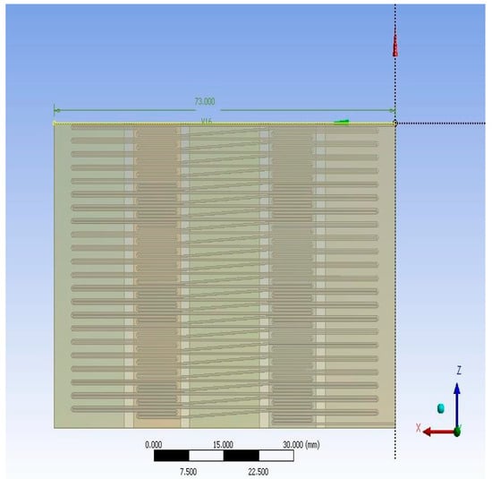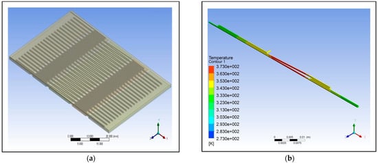For the simulation of the proposed microfluidic PCR chip, the designs drawn using ANSYS are shown in Figure 3. The five copper plates seen in Figure 3b were set at temperatures 58 °C, 72 °C, 95 °C, 72 °C, and 58 °C for the first simulation, temperatures 60 °C, 74 °C, 97 °C, 74 °C, and 60 °C for the second simulation, and temperatures 63 °C, 77 °C, 100 °C, 77 °C, and 63 °C for the third simulation for each material (the order of temperatures corresponds to the order of plates seen in the figure).
