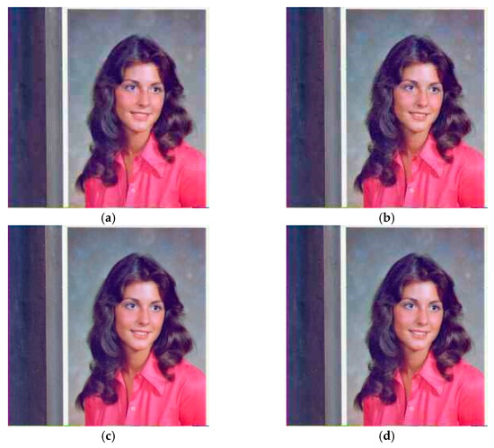 Now, we show the results obtained for the color image 4.2.07. In Figure 7, we show the decoded images obtained by executing the four algorithms via a compression rate ρ ≈ 0.10.