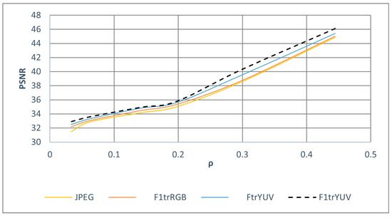 Figure 6 shows the trend of the PSNR index obtained by varying the compression rate. The trends obtained by executing JPEG and F1-transform are similar. However, for strong compressions (ρ < 0.1), the PSNR value calculated by executing JPEG decreases exponentially as the compression increases: this result shows that the quality of the decoded image obtained using JPEG drops quickly for very high compressions. The highest PSNR values are obtained by performing YUV F-transform and YUV F1-transform. In particular, the PSNR values obtained with the two methods are similar for ρ < 0.2, while, for lower compressions, YUV F1-transform provides decompressed images of better quality than those obtained with YUV F-transform.