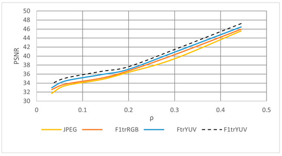 In Figure 9, the trend of the PSNR index is plotted obtained by varying the compression rate. The best values of PSNR are obtained by executing YUV F1-transform. The trend of the PSNR obtained by executing the YUV F-transform is better than the one obtained by executing F-transform and JPEG. As the results obtained for the color image 4.1.04 show, the trend of PSNR obtained by executing JPEG for the image 4.2.07 decays rapidly as compression increases (ρ < 0.1).