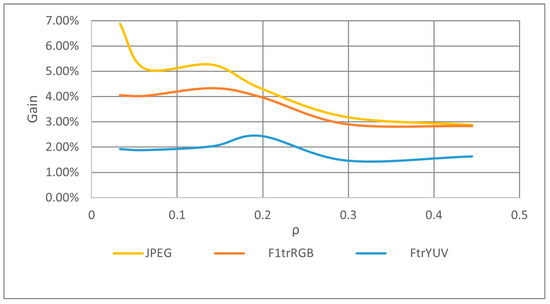 The gain of YUV-F1-transform compared to JPEG is always greater than 2%, regardless of the compression rate; similarly, the gain of YUV-F1-transform compared to F1-transform in the RGB space is greater than 1% regardless of the compression rate. The gain of YUV-F1-transform compared to YUV-F-transform is always positive and reaches values greater than 1% for strong (ρ < 0.05) and weak compressions (ρ > 025).