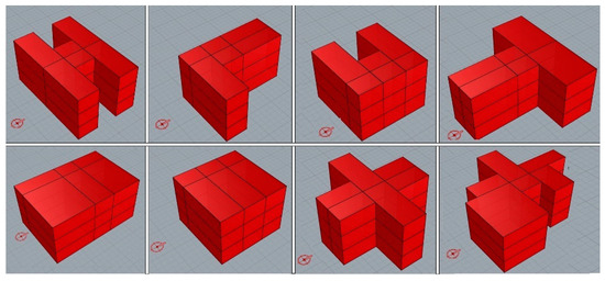 This study proposes many new and common form generation methods to generate diverse building forms with different shapes and to compare their thermal energy performance. The simple three-floor open plan that generates a diversity of rectangular and squared regular and irregularly shaped forms was proposed before by [35]. Its results are considered in comparing the new proposed forms in this paper. Since the manipulation of floor height in this previous study proved to have a negative impact on enhancing energy performance, building height as a dynamic parameter was excluded. Rhino and its plugin Grasshopper [34] are used to model the building forms parametrically and to control their dynamic parameters. First, a letter form is proposed that generates a diversity of building forms, including H, L, U, T, cross-shaped, rectangle, square, and other random complex forms. Figure 3 shows a few examples of the possible forms that could be generated. This letter form is a three-floor cellular office building where each floor has six cells. The letter forms’ dynamic parameters are shown in Table 1. The form is composed of three cells adjacent to another three cells on each floor with equal size. Each of the three vertically connected cells can expand their depth in the outward direction (east and west facades). In addition, each three vertically connected cells in the north and south facades only are allowed to expand their length in the outward direction. The expansion values are in percentages, which means that the base case value is regarded as 1% whereas if the base case is equal to 4 m the value 1.5% is equal to 6 m. Finally, the building is allowed to change its orientation starting from 0 to 2 radians.