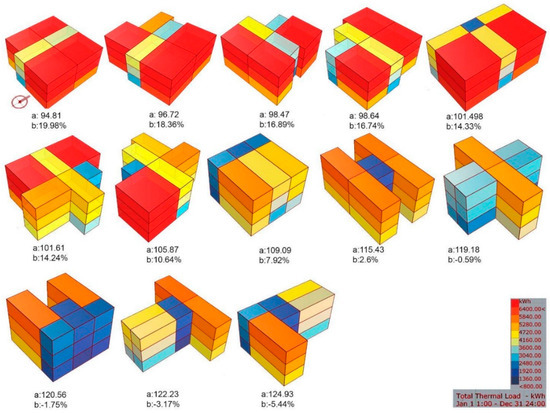 Shows Cairo Pareto-Front solutions for the Letter shape. Design configurations are ordered from the optimal EUI to the worst (from left to right, and from top to bottom). (a: Thermal EUI (kWh/m2), b: Percentage of increase or reduction in comparison to the base case). All perspectives are taken from the same south-east view angle and position. The North arrow is presented in the top left side and the zones are assigned colors according to their total thermal load with numerical range between 800 and 6400 kWh.