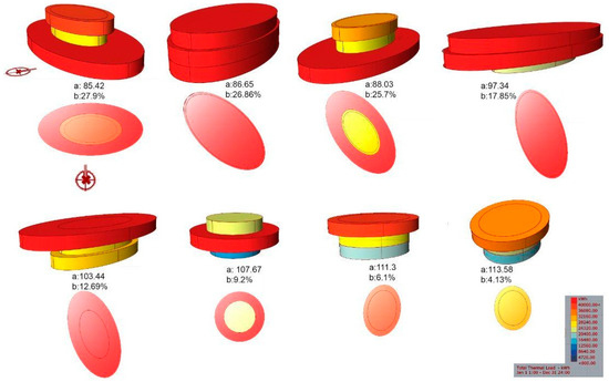 Only shape, orientation, and geometric aspect ratio can vary in this optimization process. As indicated in Figure 4, Figure 5, Figure 6 and Figure 7, the Pareto-Front iterations for the four cases provide an overview of the shape optimization results with thermal EUI load (a) and the enhanced percentage in comparison to the base case (b) for the four scenarios.