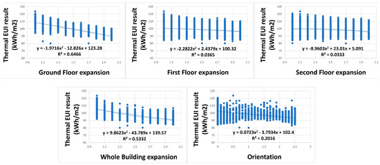After finishing the optimization for all the building forms and finding the round family as the form family with the best performance. Optimization was run again for the round family to test more iterations and to reach 1726 simulated design configurations with no redundancy. Then scatterplots were developed to show the relationship between each dynamic parameter and the annual thermal EUI objective function. Figure 8 shows scatterplots where each graph shows the relationship between one dynamic parameter value and thermal EUI values. In the scatterplots, the trend direction is shown among the simulated iterations. Each blue circle represents one iteration, whereas the Annual thermal EUI (kWh/m2) values are shown on Y-Axis, and the dynamic parameter values are shown on X-Axis. All dynamic parameters appeared to positively impact enhancing annual thermal EUI of the round shape with different levels as the R2 for the scatterplots ranges between 0.6466 and 0.201. Expansion of the ground floor has the strongest positive impact on enhancing thermal EUI (R2 = 0.6466) then the whole building expansion (R2 = 0.533), then the rotation of the building (R2 = 0.20), and finally, both the first and second floors expansions that have the least positive impact on EUI (R2 = 0.036 and R2 = 0.033).