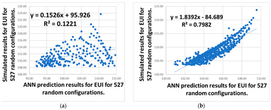 Although the prediction of the EUI of the tested prototypes was instant due to the nature of using ANN for prediction, it is essential to note that the training time for these datasets is longer than the prediction time by default. The longest time consumed for training the used data sets was 15 min. with the ANN set to have 30% of the training data as training validation. The ANN structure consisted of three hidden layers of 4, 3, and 2 nodes in order from input to output. The training iterations were set to 1000 to try and compensate for the relatively small size of the database. Better results have been achieved by a lesser number of layers for a smaller portion of the training data, as shown in Figure 9. The self-validation ratio was the same for this one. However, the number of data entries was less, 527 inputs, with two hidden layers of 4 and 2 nodes and 527 iterations in backpropagation training for the ANN. The training time for this training set was around 3 min only. Clearly, this only indicates the time-saving capabilities for such a time costly process. This trial opens the door for further investigation of utilizing ANN applications in the prediction of the different aspects of the performance of the built environment and saves the time consumption costs in the early stages of the design phase.