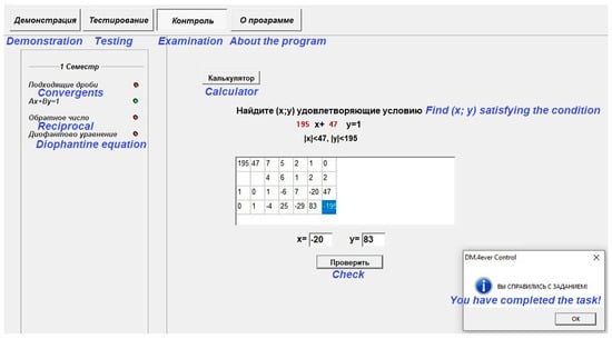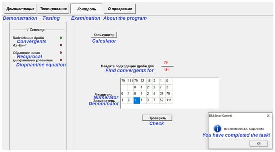 - Bogdanov, M.S. Automation of checking the solution of the problem according to the formal description of its conditions. Comput. Tools Educ. 2006, 4, 51–57. (In Russian) [Google Scholar]