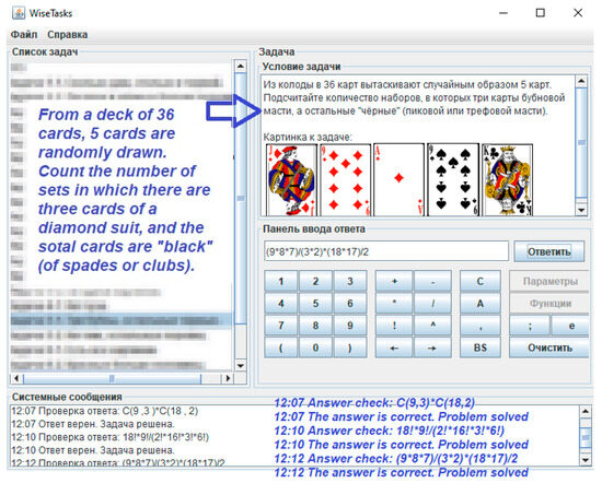 The program Wise Tasks Combinatorics [] is built on the idea of a connection between algebraic and computational interpretations.