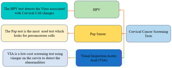 Traditional segmentation methods, such as Gaussian mixture models, Gray-level co-occurrence matrix (GLCM), Wavelet transform, Watershed, Otsu, and Voronoi, have been employed for cervical segmentation []. However, deep learning methods, including U-Net, MaskRCNN, and convolutional neural networks (CNNs), have shown remarkable success in biomedical image segmentation []. Previous approaches relying on conventional techniques and mathematical algorithms have limitations when dealing with complex cell structures due to noise contamination, overstaining, and poor resolution. In recent years, machine learning techniques, particularly deep learning, have emerged as promising approaches for medical image segmentation, offering improved accuracy [,]. In this study, the effectiveness of the U-Net architecture, a widely recognized deep learning model for biomedical image segmentation, for Pap smear image segmentation has been investigated. Figure 1 highlights the common types of cervical cancer screening tests.