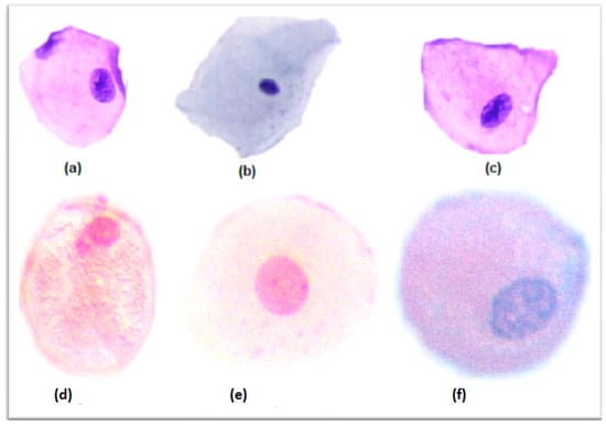 Microscopic images of cervical tissue cells from the database. (a–d) illustrate normal cells: (a) superficial squamous cell, (b) intermediate squamous cell, (c) parabasal squamous cell, (d) basal squamous cell. (e,f) show abnormal cells: (e) low-grade squamous intraepithelial lesion (LSIL) and (f) high-grade squamous intraepithelial lesion (HSIL).