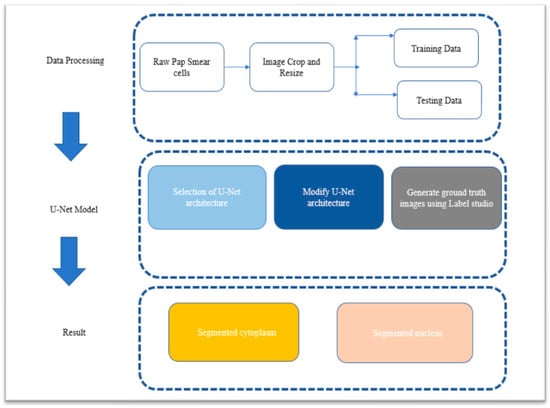With the advent of digital medical imaging equipment, there has been a growing interest in utilizing image processing techniques for medical image analysis. Biomedical image analysis has been an active area of research, aiming to develop automated diagnostic systems. These systems typically employ three main approaches: segmentation, feature extraction, and classification. Precise segmentation is crucial in biomedical imaging as it highlights regions of interest for further investigation. In the case of Pap smear analysis, segmentation is performed to accurately analyze the nucleus and cytoplasm of cervical cells. Image segmentation, a subfield of computer vision and image processing, aims to group similar areas or regions within an image []. It can be categorized into different types, including semantic segmentation, instance segmentation, and panoptic segmentation. Manual pathological observations often require examining numerous cell nuclei within a single slide image, whereas deep-learning-based pixel-level segmentation techniques enable the simultaneous identification of various cell structures, facilitating the localization of areas of interest.