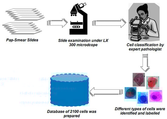 The dataset utilized in this research comprises Pap smear slides obtained from the Department of Pathology at the “Sher-i-Kashmir Institute of Medical Sciences Soura” in Kashmir. A total of 110 slides were collected, out of which 30 slides were deemed unsuitable due to issues such as overstaining or the absence of appropriate cells for automatic diagnosis of cervical cancer. The remaining 70 slides underwent meticulous analysis by expert pathologists following the Bethesda system of classification to ensure accurate cell categorization. The examination of the Pap smear slides was carried out using an LX 300 microscope with 240 volts and the MICAPS software. The dataset consisted of 2100 cervical cells obtained from a Pap smear test captured using a MICAPS camera at a magnification of 100×. All cells were consistently maintained at a resolution of 2540 × 2540 pixels, which facilitated easy cropping of individual cells during the model training process. To create a comprehensive database, a collaborative effort was undertaken with pathologists. This involved the meticulous categorization of the cervical cells based on specific characteristics. Subsequently, a well-curated database was established, comprising a total of 2100 cells representing six distinct types of cervical cells. Care was taken to maintain a balanced distribution of 300 cells per class to assess the impact of noise on the segmentation process. Table 1 provides a detailed description of the various cell types present in the Pap smear test. The prepared dataset consists of 700 abnormal images and 1400 normal images, ensuring a balanced representation of different cell types for further analysis and model development. The creation of the primary dataset involved several steps, as depicted in Figure 6.