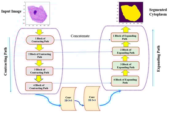 The primary objective of the U-Net architecture is to achieve precise semantic image segmentation, particularly for biomedical images. Originally proposed with 572 × 572 input images and 64 feature channels for biomedical image segmentation [], the U-Net model was modified to 128 × 128 through pre-processing (resizing). Additionally, the feature space was reduced to 16 channels instead of the default 64. The top left layer of the network serves as the input layer, accepting colored 2D images of size 128 × 128 × 3 (height, width, and RGB value of an image). The output of the first layer results in a feature map of size 128 × 128 × 16. The convolution operations use 3 × 3 matrices with a kernel size of 3 × 3. To maintain a balance between the input and output image sizes, one extra pixel was added to the edges of the image. Subsequent operations include a 2 × 2 max-pooling layer, which selects the maximum value within each 2 × 2 region, thereby reducing the dimensions by half (64 × 64) and generating 32 feature channels. This process continues with the 3rd and 4th contracting blocks, resulting in configurations of 32 × 32 × 64 and 16 × 16 × 128, respectively. After the contraction stage, the configurations become 8 × 8 × 128 and 8 × 8 × 256. Next, an up-sampling operation from the 8 × 8 × 256 configuration to 16 × 16 × 128 is performed, followed by the 4th block of the decoder, achieving a 32 × 32 × 64 configuration. The 3rd block of the decoder produces a configuration of 64 × 64 × 32, and finally, the output layer yields a segmentation map of size 128 × 128 × 1, representing the cytoplasmic segmentation of Pap smear cells from their respective nuclei. Each contract block consists of two convolutional layers using 3 × 3 kernels, followed by a max-pooling layer with a size of 2 × 2 and a dropout layer with a dropout rate. An expand block includes a transposed convolutional layer using 3 × 3 kernels, a concatenation layer that incorporates spatial information from the contract blocks, a dropout layer with a dropout, and two convolutional layers using 3 × 3 kernels. Figure 8 and Figure 9 provide diagrammatic representations of how the U-Net architecture is implemented for the segmentation of cytoplasm and nucleus from Pap smear images.