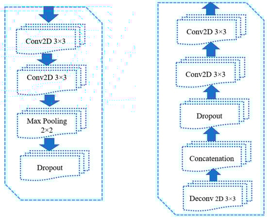 Individual blocks of the U-Net architecture used in the study; the first block consists of two convolutional layers using 3 × 3 kernels, max-pooling layer with dimensions 2 × 2 and a dropout rate; the second block consists of a transposed convolutional (deconvolutional) layer employing 3 × 3 kernels. A concatenation layer is utilized to acquire spatial information from the contracting blocks, essentially combining information from earlier stages. A dropout rate is applied followed by two convolutional layers with 3 × 3 kernels.