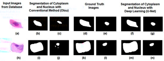 Table 2 clearly shows that intermediate squamous cells perform better segmentation compared to the other five types of cells. The Otsu method is an image thresholding technique that finds the optimal intensity value to separate foreground and background regions in a grayscale image. It calculates the threshold that maximizes the variance between the two classes, allowing for automatic image segmentation. From the above results, it is evident that the conventional Otsu method struggles to accurately segment the cytoplasm and nucleus, as depicted in Figure 10. In contrast, the U-Net approach yields improved results, with better preservation of both cytoplasm and nucleus boundaries. These observations suggest that U-Net outperforms the Otsu approach in preserving the boundaries of the cytoplasm and nucleus.