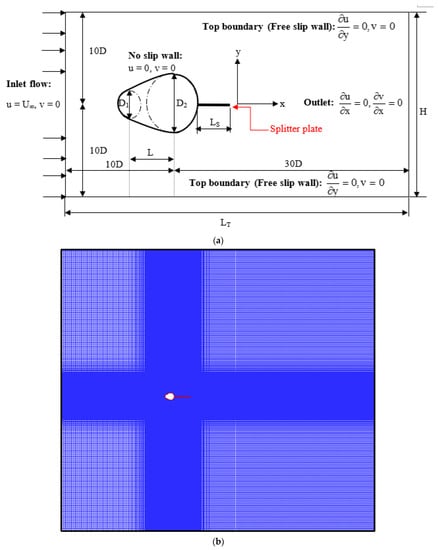 Figure 1a shows the conceptual layout of the computational domain that was employed in this study to explore the flow around a cam-shamed cylinder combined with a backward splitter plate. The lateral, upstream, and downstream limits have adequate distance from the bluff body at 10D, 10D, and 30D, respectively, for flow around the cylinder to be unhindered by the blocking effect. D1/Deq is assumed to have an absolute diameter ratio of 0.455, while D2/Deq has a comparative diameter ratio of 0.8 and 0.9. In [], it goes into detail about how the cam-shaped cylinder is made. The downstream side, or rear, of the bluff body, where the splitter plate is located, is designated by length LS. In the present research work, relative splitter plate length (LS/Deq) varies from 0.5 to 6.0.