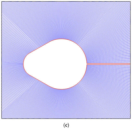 (a) Layout of the simulated physical domain and the stated boundary condition for evaluating the flow via a cam-shaped cylinder combined with a backward splitter plate; (b) computational grid structure used in this examination around the cam-shaped cylinder ( = 0.455, = 0.9, and = 2); (c) mesh enlarged view around cam-shaped cylinder.