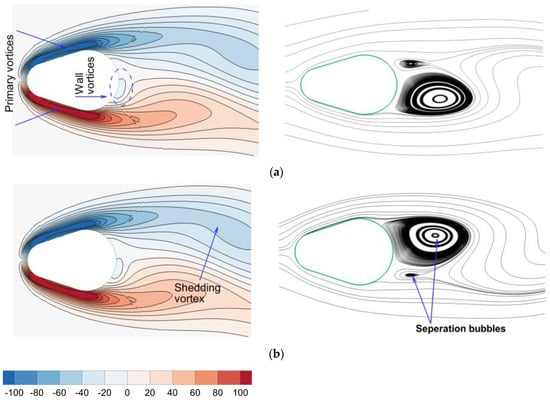 Two alternate Von-Karman vortex shedding cycles with corresponding separation bubbles are shown in the instantaneous vorticity contours and streamline plots with D1/Deq = 0.455, D2/Deq = 0.8, and Re = 100. (a) Lower primary vortex shedding and (b) upper primary vortex shedding.