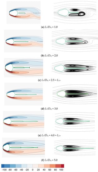 At Re = 100, the shear layers on the back side of a cam-shaped cylinder split at the top and bottom curves. The two large vortices seen in Figure 3 were fed vorticity by these separate shear layers, which entrain fluid from surrounding irrotational flow. The split shear layers are curled by the low-pressure area at the back of the cam-shaped cylinder, which diverts the two main vortices inward and causes splashback on the cylinder base. Small wall-adhering vortices were thus created. When one of the primary vortices’ associated curled splitting shear layers influences the flow from the opposing side of the wake centerline, the vortex’s growth stops and it begins to compress. The other main vortex then coalesces with one of the walls adhering vortices, as seen in Figure 3. Islam et al. [] reported a finding quite similar to this for a square cylinder case. Therefore, in order to modify the wake regime downstream of the cam-shaped cylinder, the vorticity distribution and vortex development must be altered. As a passive flow separation control device, a backward splitter plate delays the roll-up of the shear layers and modifies the pressure distribution and vorticity of the flow field. It is often mounted to the back side of the cylinder. Therefore, a backward splitter plate with a length range of 0.5Deq to 6Deq is taken into consideration in the current study effort. This very long splitter plate is enough to prevent vortex shedding and regulate flow.