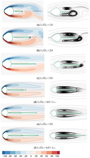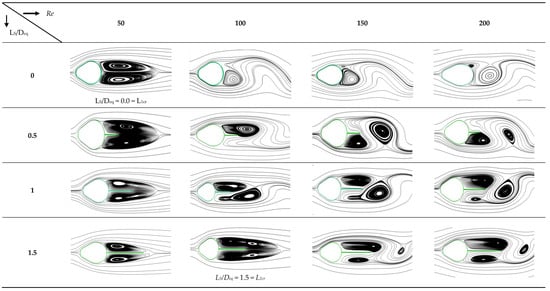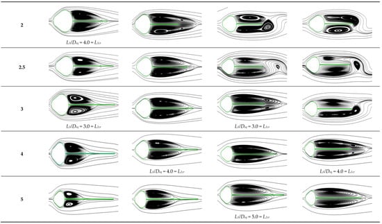 Re and Ls/Deq combined impact on instantaneous streamlines is shown in Figure 6 for D1/Deq = 0.455 and D2/Deq = 0.9. The splitter plate significantly alters the wake regime, as is seen from Figure 6. Furthermore, it is discovered that when Re increases, a longer splitter plate is needed to suppress both twister shedding (L1cr) and shear layer contact (L2cr).