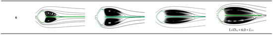 Within the recirculation length in regime 4, a splitter plate is in touch with the shear layer, but the flaking of twisters in the downstream is not seen. But in this environment, two centers for every recirculation bubble are visible, as seen in Figure 7d. Regime-4’s official name is Regime 4, and its associated flow pattern is SF-DC-SIE. Strong shear effects, which are present in regimes 2 and 4, may be the cause of the splitting of single vortex cores (SC) into double vortex cores (DC), which is observed in these regimes. Single vortex core (SC) recirculation bubbles appear in regime 5 on both sides of the plate. Reattaching the shear layers to the plate’s surface prevents them from interacting with one another (SII). In this flow pattern, the recirculation length would either be precisely equal to the plate length or shorter. SF-SC-SII is the definition of the usual flow pattern for regime 5, commonly known as Regime 5, and it is shown in Figure 7e.