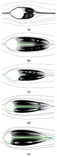 Time average rationalization for a cam-shaped cylinder embedded with a rear side splitter plate. (a) Flow pattern I (unsteady flow with single core); (b) flow pattern II (unsteady flow with double core); (c) flow pattern III (steady flow single core and with shear layer interaction); (d) flow pattern 4 (steady flow double core and with shear layer interaction); (e) flow pattern 5 (shear layer and single-core steady flow are prevented).