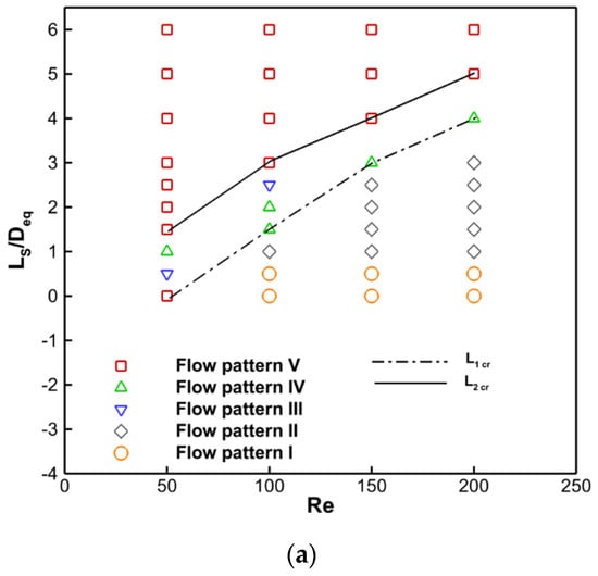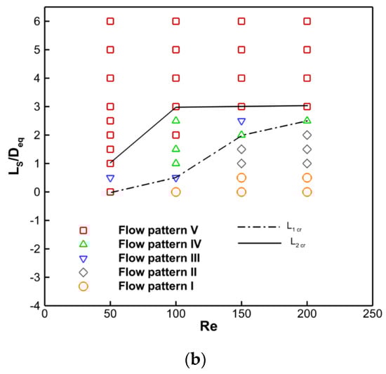 For all the studied cases, flow patterns and space diagrams for different values of Re, Ls/Deq and D1/Deq = 0.455, D2/Deq = 0.9, and D1/Deq = 0.455, D2/Deq = 0.8 are represented in Figure 8a,b, respectively. According to Figure 4, Figure 5, Figure 6, Figure 7 and Figure 8, the splitter plate attachment alters the vortex creation process, narrows the wake zone, and lengthens the twister formation region, which reduces the frequency of vortex flaking.
