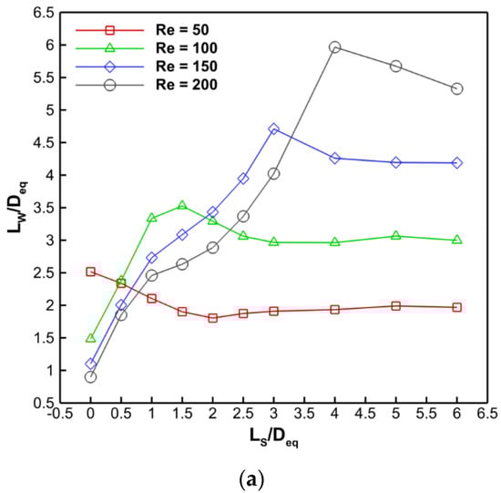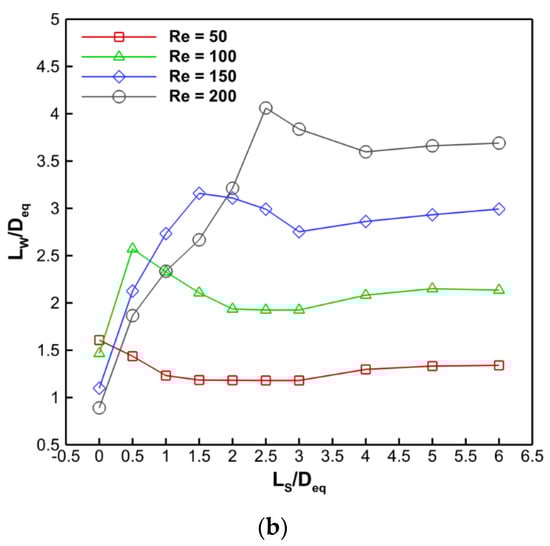Figure 9a,b, which show the time average vortex recirculation length (Lw/Deq) as a function of Re and Ls/Deq for D1/Deq = 0.455, D2/Deq = 0.9, and D1/Deq = 0.455, D2/Deq = 0.8, respectively. It has been shown that the wake length grows as the splitter plate length increases, reaches a maximum value at L1cr, and then begins to decrease. Up until L2cr, there is a reduction in wake length, while following increases in splitter plate length have no impact on wake length. Additionally, the wake duration shortens when D2/Deq falls from 0.9 to 0.8. This is because shear layer interaction is present.