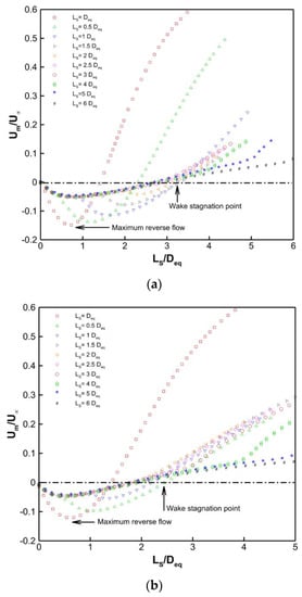 For (a) D1/Deq = 0.455, D2/Deq = 0.9, and (b) D1/Deq = 0.455, D2/Deq = 0.8, the mean recirculation length (LW/Deq) difference with splitter plate length (LS/Deq).