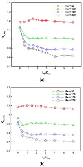 Time-averaged drag coefficient (Cd-avg) of a cam-shaped cylinder attached with a splitter for (a) D1/Deq = 0.455, D2/Deq = 0.9, and (b) D1/Deq = 0.455, D2/Deq = 0.8.