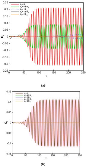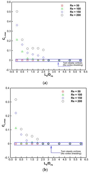 With varying values of Ls/Deq, Re, and D1/Deq = 0.455, D2/Deq = 0.9, and D1/Deq = 0.455, D2/Deq = 0.8, respectively, Figure 13a,b show the fluctuation of the maximum lift coefficient (CL-max). Therefore, the pressure is lowest on the side furthest from the source of the vortices and highest on the side towards the center. Therefore, the forces operating on the body fluctuate, and the lift force that results in oscillations on the body has a frequency equivalent to the vortex’s shed frequency. It is obvious that as splitter plate length increases, the maximum lift coefficient value lowers until it reaches zero at Ls/Deq = L1cr. This is due to the fact that the flow is constant for this duration. Furthermore, when D2/Deq decreases from 0.9 to 0.8, the maximum lift coefficient magnitude decreases. Thus, it is abundantly obvious that the USF is associated with a greater maximum lift coefficient.