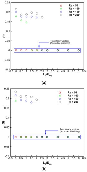 Variation of the Strouhal number (St) with respect to the splitter plate length (LS/Deq): (a) D1/Deq = 0.455, D2/Deq = 0.9, and (b) D1/Deq = 0.455, D2/Deq = 0.8.