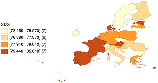 Spatial distribution of SDG within mean values. Note: numbers in square brackets mean the thresholds for each cluster group within SDG’s mean values; numbers in round brackets—number of countries in each cluster.
