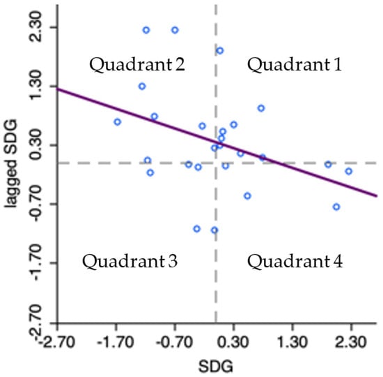 The Moran scatterplot facilitates the examination of the connection between a specific value and the mean value of that variable among neighboring entities. The results from the Moran’s I analysis (Figure 2) indicate that the majority of countries are situated within the first and second quadrants.
