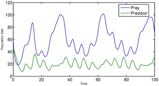 Lotka–Volterra dynamics (28) with and , and initial condition .