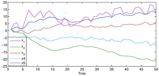 Here we consider a large-scale dynamical system where the number of measurements is significantly larger than the dimensionality of the underlying system. The dynamics under consideration have an underlying low-dimensional attractor. To construct these large-scale systems, we use MATLAB’s Discrete Random State Space Method. We have chosen a five-dimensional model with two input variables and 50 measurement variables. The output is a state space model: and (and , ). We generate a matrix of random inputs, , by using MATLAB’s randn command. Using matrices A, B and , we generate output data for snapshot matrices X and Y, which are of the dimensions , and is of dimensions .