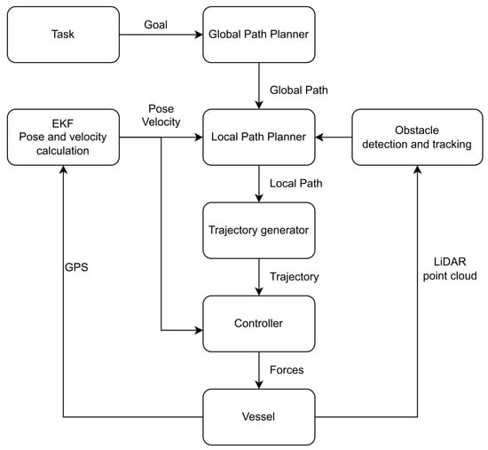 The movement of an ASV can be expressed using two reference frames: the inertial and the vessel’s own reference frame. In the inertial reference frame, it can be condensed in a three-degrees-of-freedom (DOFs) vector , presenting the vessel’s position (x and y) and orientation () []: