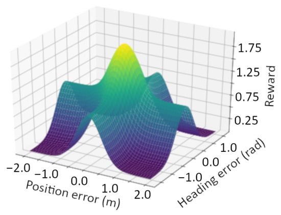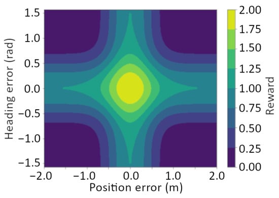 Understanding the reward values throughout the system’s observation space can be difficult, so to gain a better understanding of the multivariate Gaussian terms in the reward function Figure 3 and Figure 4 offer a 3D plot and a 2D contour plot. From the figures it is clear that this, being the most significant part of the reward function, rewards proximity to the goal position within a radius of around 1 m, with a look-ahead heading error less than 0.5 radians.