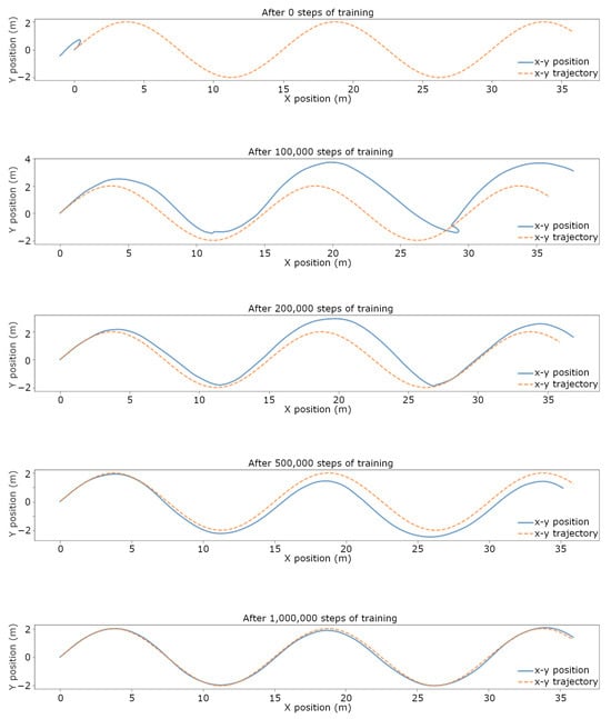 Visualization of intermediate trajectory tracking training results for the RL controller upon initialization: 100,000, 200,000, 500,000, and 1,000,000 training steps.
