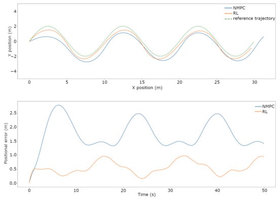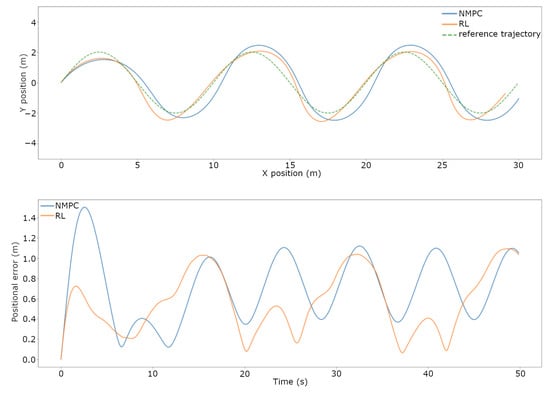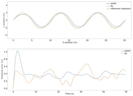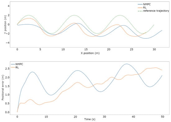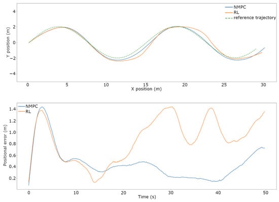 Scenario 4—wind. Comparison between the NMPC and RL algorithm trajectory tracking performance with a wind of speed 9 m/s acting on the system. Trajectories of NMPC, RL, and reference sine wave on the top graph. Tracking errors of NMPC and RL on the bottom graph.