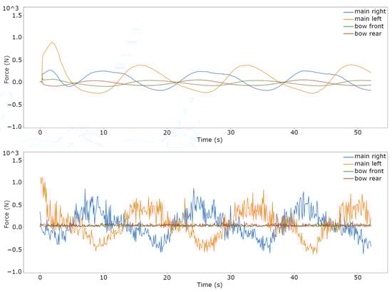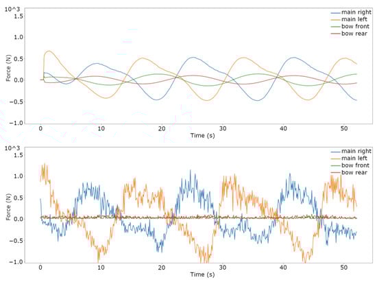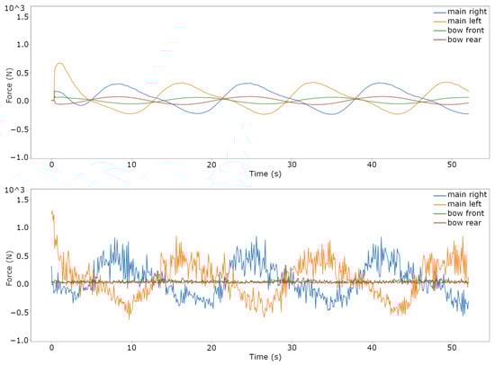 Scenario 2—payload. Comparison between the NMPC and RL algorithm trajectory tracking performance with payload equal to 50% of vessel’s mass. Force allocation of NMPC (top graph) and RL (bottom graph) for tracking the sine wave trajectory.