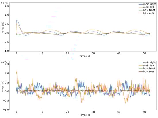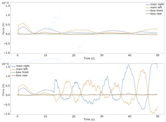 In scenario 2—payload, when significant payload is added to the vessel, as expected, the system becomes more sluggish and the task of trajectory tracking more difficult. This can be seen best in the amplitudes of the sine wave trajectories in Figure 9 and Figure 10, where overshooting can be seen. Both controllers still remain more or less capable of tracking the trajectory and once again the force signal output of the RL-based controller contains undesirable high oscillations.