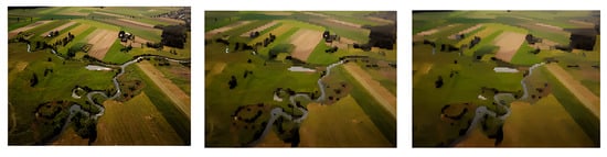 In addition to averaging the color components in the sliding window, the median can be determined. The colors of the window elements are converted into binary and ranked, the median is determined, and the color of the remaining pixels of the window is replaced with the original color of the pixel belonging to the median. Using the median of the color components in the areas of the image leads to a similar effect—the result is a distorted abstract image. Images obtained using the median method with different steps are shown in Figure 2.