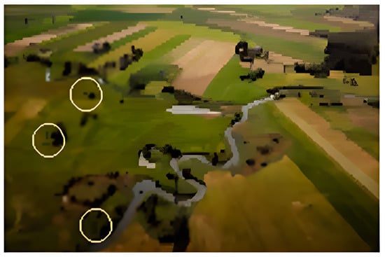 Experimental research of operator search activity involves creating a task in the form of a certain game with appropriate incentives and penalties. Isolated experiments with such images do not give a complete picture of such search activity. Therefore, sets are used for each game. Figure 3 shows a view of such an image with objects of attention of a given class localized on it. In the selected circles, the objects of concentration have the shape of rectangles of a darker color than the background. In this case, it is a class of rectangular objects. They differ in color and size and are marked with circles. One object is in the upper process, and two are in the middle. For example, in the given task, the objects can be cars, tents, etc. The lower circle has a less visible object and its left edge merges with the background. It can be detected and recognized only by geometric features of straight lines and angles. An important point in the localization of objects on the image is the position of the visual axis when shooting. In this image, the terrain is photographed at an angle to the horizon, not perpendicular to the surface. In this case, it is necessary to consider the change in the size of the searched object according to the image’s perspective, i.e., the objects located in the distance should have smaller sizes than those localized in the front.
