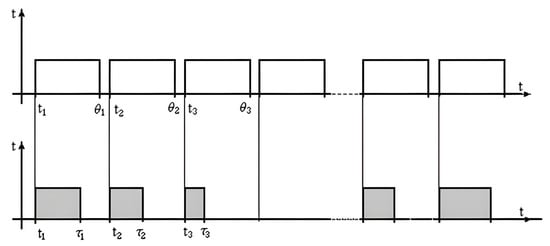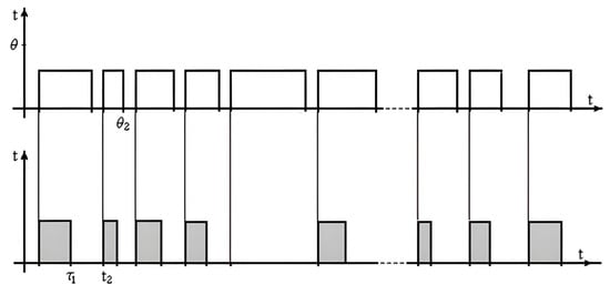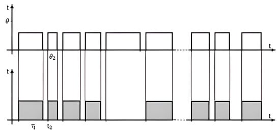 For the organization of experimental studies, the following three options can be specified for the method of providing test images to the operator on the monitor. Each of them includes two streams of rectangular pulses, synchronized in time along the pulse front. In the first version in Figure 5, the upper sequence corresponds to a regular stream of test images, marked by light rectangular pulses of the same duration and amplitude. Here, the exposure of the tests is carried out at the same time intervals. The images of the situations are presented in a regular sequence (Figure 5).