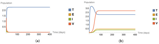 In the first scenario (a), corresponding to , we have a disease-free equilibrium point (disease fails to establish), the target cell population levels off at a positive equilibrium level, but the exposed, the infected, and the virus cells fail to establish and tend to 0. In the second scenario (b), corresponding to , we have a stable infection equilibrium point, all four cell types settle in an equilibrium value.