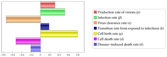 In this subsection, we perform a sensitivity analysis to study how different parameters affect the magnitude of the basic reproduction number . In order to do so, we perform Partial Rank Correlation Coefficients (PRCC) analysis. This method enables us to assess the effect of each input parameter on the outcome parameter ( in our case). Parameters with a positive PRCC value are positively correlated with the outcome parameter, i.e., increasing any of the will increase the basic reproduction number, while those with a negative PRCC value are negatively correlated with meaning that an increase of their value will result in a decrease of the basic reproduction number. The results of the analysis, shown in Figure 4, suggest that cell birth rate has the largest positive effect on the basic reproduction number, followed by the infection rate and the production rate of virions p, while virus clearance rate c and cell death rate d are the parameters which most efficiently decrease the value of .